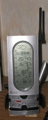 However in September 2002 a major part of the home built system failed and I replaced it with a ready made wireless system. The outdoor temperature sensor and rain gauge was on the garage roof as can be seen to the right while the display unit gives better information and includes a simple barograph.